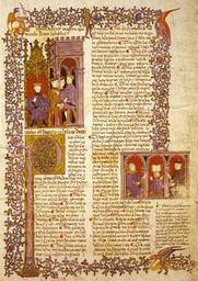 | Keywords: Alba Bible 1v.l.jpg en Miniature 1 Don Luis de Guzmán sits on the left in a cathedral and hands a letter addressed to 'Rrabi Mose' to one of the three squires standing to the right The Grand Master raises his right forefinger to alert the squire who holds the letter A falcon perches on his other hand The four figures bear the red cross of the Order of Calatrava on their shoulders The caption to the miniature reads 'figura del señor maestre que mando fazer la Biblia' Old Spanish picture of the lord master who ordered the production of the bible Miniature 2 Moses Arragel sits between Brother Arias de Ençinas Father Superior of the Monastery of Saint Francis of Toledo to the right and Don Vasco de Guzmán Archdeacon of Toledo to the left with his back turned to the reader Their forefingers are raised in instruction while he points towards them discussing the work he is to compose The Franciscan wears a doctoral hat and the brown habit of his order The Dominican wears a black cope and holds his doctoral hat in his hand 1422 http //www facsimile-editions com/en/ab/ The Alba Bible author PD-old-100 Uploaded with UploadWizard Alba Bible |