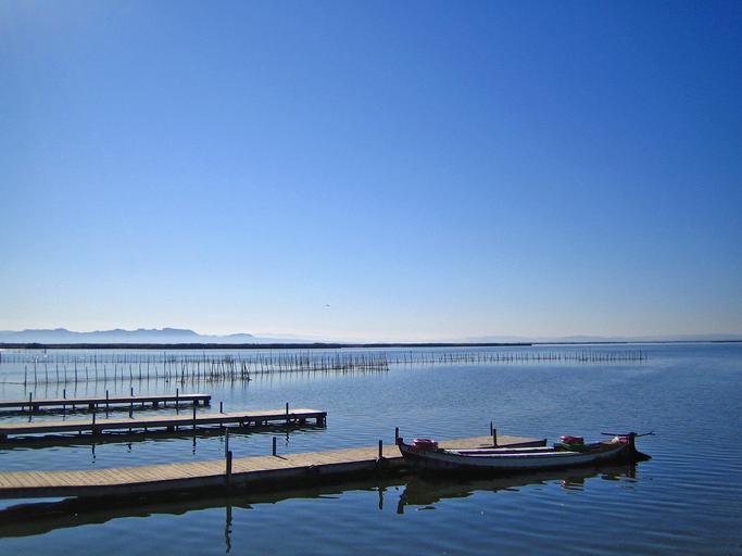 Keywords: Albufera lagoonin valencia Spain beach boat dock blue sky