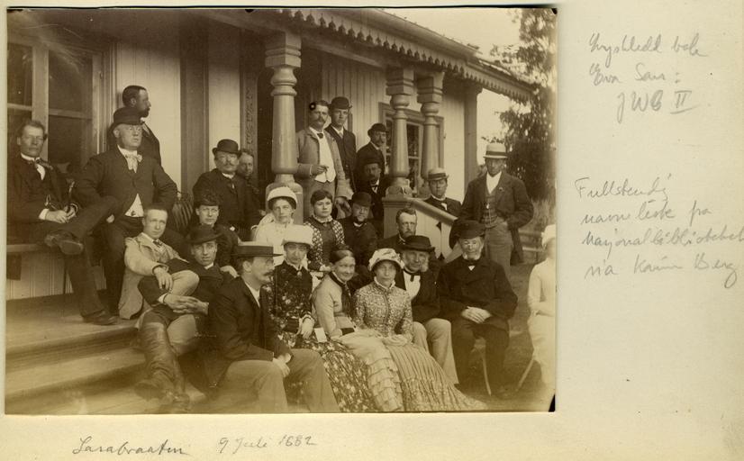 Keywords: gruppe veranda gruppeveranda thomas joh. heftye thomasjohheftye thomas johannessen heftye thomasjohannessenheftye thomas j. heftye thomasjheftye thomas heftye thomasheftye heftye monochrome 9. juli 1882. Disse var på Sarabråten denne dagen, og noen av dem er sannsynligvis med på bildet: - Axel Bergström ?? - Ferdinand Meldahl, mulig nærest fotografen, i profil. - A. Meldahl - Fr. Kriege - Louise Bölling - Eskilda Bruun - Eva Sars (barhodet, midt i bildet m "prikkete" kjole) - Kristine Heftye - N A Andresen (sannsynligvis Nicolai August, bror til Johan Henrik (som var stamgjest på Sarabråten og tobaksfabrikant)-sitter på stol helt til høyre - August Andresen - Hanna Andresen - Marie Heftye - Johan Carl Keyser, sitter på nederste trappetrinn ved siden av Andresen - Schlytter, Hans (ytterst til venstre) - A Blytt (barhodet, ut mot rekkverk mot høyre.) - Peter Krefting - August Spørck (sitter på øverste trappetrinn i lys jakke) - Johannes Heftye - R Collett - Axel Killdahl - J Knagenhjelm - Jacob Heftye - Jens Gran, sitter bak, midt på bildet med hatten på snei (som vanlig) 9. juli 1882. Disse var på Sarabråten denne dagen, og noen av dem er sannsynligvis med på bildet: - Axel Bergström ?? - Ferdinand Meldahl, mulig nærest fotografen, i profil. - A. Meldahl - Fr. Kriege - Louise Bölling - Eskilda Bruun - Eva Sars (barhodet, midt i bildet m "prikkete" kjole) - Kristine Heftye - N A Andresen (sannsynligvis Nicolai August, bror til Johan Henrik (som var stamgjest på Sarabråten og tobaksfabrikant)-sitter på stol helt til høyre - August Andresen - Hanna Andresen - Marie Heftye - Johan Carl Keyser, sitter på nederste trappetrinn ved siden av Andresen - Schlytter, Hans (ytterst til venstre) - A Blytt (barhodet, ut mot rekkverk mot høyre.) - Peter Krefting - August Spørck (sitter på øverste trappetrinn i lys jakke) - Johannes Heftye - R Collett - Axel Killdahl - J Knagenhjelm - Jacob Heftye - Jens Gran, sitter bak, midt på bildet med hatten på snei (som vanlig) |