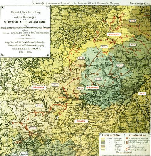 | Keywords: Albwasserversorgung 1881.jpg Swabian Alb Germany map depicting the network of drinking water supply first 9 groups status quo 1881 Original scale 1 200 000 Schwäbische Alb Albwasserversorgung Darstellung der ersten 9 fertiggestellten Wasserversorgungsgruppen 1881 Originalmaßstab 1 200 000 Scanned and slightly modified by Density 1881 Karl Ehmann PD-old 19th-century maps of Baden-Württemberg 1881 maps | ||||