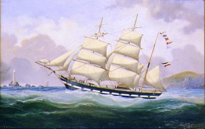 | Keywords: Alexander K. Branden - Ship Portrait of the German Bark BOBSIEN-KAEGSDORF.jpg Die Bark Bobsien-Kaegsdorf war 1863 von O Ludewig in Rostock in Holz mit Zinkbeschlag für den Reeder H C Brockelmann aus Rostock gebaut worden Größe 162 Lasten 347 RGT Das werftneue Schiff übernahm Kapt L Möller aus Wustrow mit 13 Mann Besatzung 1897 wurde der Segler als Kohlenhulk nach Brunsbüttel verkauft ca 1880 oil canvas cm 67 105 http //www fineartemporium com/Werdere htm Werder Collection Germany object history credit line accession number http //www fineartemporium com/we-Branden-Bobsien-image htm fineartemporium com PD-Art-100 Bobsien-Kaegsdorf ship 1863 19th-century sailing ships in paintings 1880 paintings |
