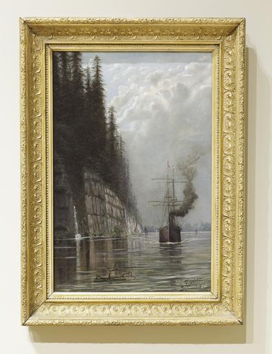 MAKE A MEME View Large Image Alexis Jean Fournier - Off the Coast (Lake Superior) - 2012.45 - Minneapolis Institute of Arts.jpg sailing vessel with drawn sails; trolling in calm water towards viewer; at L rock face shoreline crested with pine trees; gold frame 29 3/4 x ...