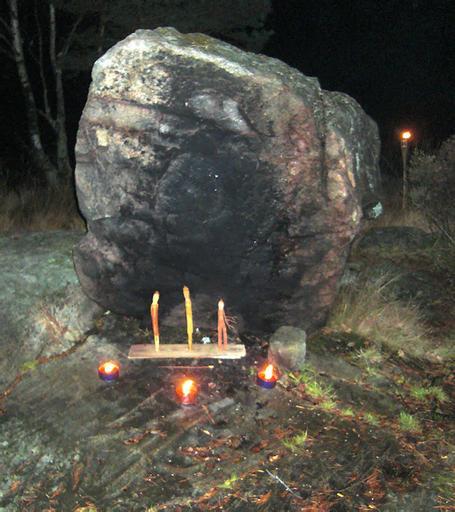 Keywords: Alfablot at boulder with flash.jpg en Forn Sed Álfablót at boulder The picture is taken at an álfablót held by the Gothenburg kindred Godthiod at 7th November 2009 at a boulder at Getsjön i e Goat Lake Tunge parish Ale hundred Västergötland Lilla Edet municipality Västra Götaland Sweden Álfablót is a Norse ceremony honoring the dead ancestors and elves and it's corresponding to the Celtic Samhain The boulder has a tradition of being thrown by a giant It has the number Tunge 36 1 in Swedish National Heritage Board's database over ancient monuments Godthiod was a kindred within the Swedish Asatru Assembly now Forn Sed Sweden The altar consists of three cult images of the three Norns Urð Verðandi and Skuld the Norse goddesses of Fate and three lighted cressets on the ground These are placed in front of the boulder The boulder is used as a blóting stone during the ceremony and is thus receiving libations In the background to the right is a lighted torch In the foreground we can see a strange pattern in the bedrock of the place The photo is taken with a flash after the ceremony when the offerings have been taken away Samfundet Forn Sed Sverige Altaret utgörs av tre gudabilder föreställande de tre nornorna Urd Verdandi och Skuld och tre tända marschaller på marken Dessa står framför flyttblocket Flyttblocket används som blotsten under ceremonien och mottager då libationsoffer I bakgrunden till höger lyser en fackla I förgrunden ser man det märkliga mönster berget har på platsen Fotot är taget med blixt efter blotet sedan offergårvorna blivit sända eller soade jämför senda och sóa i Hávamál strof 144 10180300360001 RAÄ-nr Tunge 36 1 own Gunnar Creutz 2009-11-07 ImageNote 1 173 341 124 102 564 635 2 The three Norns Urðr Verðandi and Skuld ImageNoteEnd 1 Forn Sed Sweden Photos of paganism by User Achird Seasonal ceremonies November 2009 in Sweden Neopagan altars Glacial erratics with traditions in Sweden Public domain files by Gunnar Creutz |