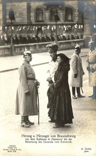 | Keywords: Alfred Grohs Herzog und Herzogin von Braunschweig vor dem Rathause in Hannover bei der Beisetzung des Generals von Emmich, Bildseite Großherzog von Oldenburg Gustav Liersch & Co. 7592.jpg Alfred Grohs mit dem Untertitel Herzog und Herzogin vor dem Rathause bei der Beisetzung des Generals von Emmich Die selbe Aufnahme mit einem anderen Bildausschnitt brachte ebenfalls der Verlag von Gustav Liersch Co mit der selben fortlaufenden Bestell- Nummer 7592 heraus jedoch mit leicht verändertem Titel im Gespräch mit dem Großherzog von Oldenburg Zu sehen ist Ernst August von Hannover III Herzog von Braunschweig Herzog zu Braunschweig und Lüneburg Prinz von Hannover mit seiner Gemahlin Viktoria Luise Herzogin zu Braunschweig-Lüneburg Prinzessin von Hannover Prinzessin von Großbritannien und Irland auf dem Trammplatz im Gespräch mit Großherzog August II von Oldenburg kurz vor der Beerdigungs-Prozession mit großem Gefolge für den verstorbenen General Otto von Emmich zum Engesohder Friedhof Die beiden im Hintergrund ebenfalls mit Pickelhaube verzierten Herren konnten bis auf Weiteres noch nicht identifiziert werden A so-called Real Photo postcard RPPC taken by the photographer Alfred Grohs subtitled Duke and Duchess of town hall at the funeral of General von Emmich The same recording with a different image section also brought the publishing of Gustav Liersch Co with the same continuous order number 7592 out but with a slightly altered title talking to the Grand Duke of Oldenburg The photo shows Ernst August of Hannover III Duke of Brunswick Duke of Brunswick and Lüneburg Prince of Hannover with his wife Viktoria Luise Duchess of Brunswick-Lüneburg Princess of Hannover Princess of Great Britain and Ireland on the Tramplatz talking with Grand Duke Augustus II of Oldenburg nearing funeral procession with a large entourage of the late General Otto von Emmich to Engesohder Friedhof The two in the background also adorned with Pickelhaube men could not be identified until further notice Scan vom Original Bernd Schwabe in Hannover 1915-12 Alfred Grohs 1880 “1935 <gallery> File Alfred Grohs Herzog und Herzogin von Braunschweig vor dem Rathause in Hannover bei der Beisetzung des Generals von Emmich Adressseite rotes Dreieck Auge Sonne Lichtstrahlen jpg Adressseite der Ansichtskarte </gallery> PD-old-auto-1923 1935 Albert Theodor Otto von Emmich 191512 Frederick Augustus II Grand Duke of Oldenburg 191512 Ernst August Duke of Brunswick 191512 Princess Viktoria Luise of Prussia 191512 Alfred Grohs Gustav Liersch Co Neues Rathaus Hannover 1915 in Hannover Unidentified people of Germany |