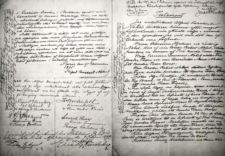 Keywords: Alfred Nobels will-November 25th, 1895.jpg Alfred Nobels last will dated november 27th 1895 Alfred Nobels letztes Testament vom 27 November 1895 Alfred Nobels sista testamente från den 27 november 1895 Alfred Nobel 2008-12-05 Photograph Prolineserver <span class signature-talk >talk</span> <br>Document Alfred Nobel <span class plainlinks >PD-Art in Sweden</span> <br/> Under http //www sweden gov se/download/129882cd pdf major 1 minor 12248 cn attachmentDuplicator_1_attachment Article 49 a anyone who has produced a photographic picture has an exclusive right to reproduce the picture and to make it available to the public This right subsists until 50 years have elapsed from the year in which the picture was produced Last Will and Testament of Alfred Nobel Transciption ;right hand side No 73 År 1897 den 5 Februari upprist vid vi Stockholms Rådstufvurätts Stjette Afdelning; bet ex officio aut Jacob Linders <big><u>Testament</u></big> Jag undertecknad Alfred Bernhard Nobel förklarar härmed efter moget betänkade min yttersta vilja i afseende å den egendom jag vid min död kan ef- terlemna vara följande Mina brorssöner Hjalmar och Ludvig Nobel söner af min Broder Robert Nobel erhålla hvardera en summa af Två Hundra Tusen Kronor; Min Brorsson Emmanuel Nobel erhåller Tre Hundra Tusen och min Brorsdotter Mina Nobel Ett Hundra Tusen Kronor; Min Broder Robert Nobels döttrar Ingeborg och Tyra erhålla hvardera Ett Hundra Tusen Kronor; Fröken Olga Boettger för närvarande boende hos Fru Brand 10 Rue St Florentin i Paris erhåller Ett Hundra Tusen Francs; Fru Sofie Kapy von Kapivar hvars adress är känd af Anglo-Oesterreichische Bank i Wien är berättigad till en lifränta af 6000 Floriner Ö W som betalas henne af sagde Bank och hvarföre sig i denna Bank deponerat 150 000 Fl Ungerska Statspapper Herr Alarik Liedbeck boende 26 Sturegatan Stockholm erhåller Ett Hundra Tusen Kronor; Fröken Elise Antun boende 32 Rue de Lubeck Paris är berättigad till en lifränta af Två Tusen Fem Hundra Francs Dessutom innestår hos mig för närvarande Fyratio åtta Tusen Francs henne till- hörigt Kapital som äger att till henne återbetalas; Herr Alfred Hammond Waterford Texas United States erhåller Tio Tusen Dollars; Fröknarna Emmy Winkelmann och Marie Winkel- <small> ;back side mann Potsdamerstrasse 51 Berlin erhålla hvardera Femtio Tusen Mark; Fru Gaucher 2 bis Boulevard du Viaduc Nîmes Frankrike erhåller Ett Hundra Tusen Francs; Mina tjenare Auguste Oswald hans hustru Alphonse Tournand anstäld vid mitt laboratorium i Sanremo erhålla hvardera en lifränta af Ett Tusen Francs; Mina förra tjenare Joseph Girardot 5 Place St Laurent Châlons sur Saône Frankrike äro berättigade till en lifränta af Fem Hundra Francs samt min förra trädgårdsmästare Jean Lecof hos Fru Desoutter receveur Curaliste Mesnil Aubry pour Ecouen S O Frankrike till en lifränta af Tre Hundra Francs Herr Georges Fehrenbach 2 Rue Compiègne Paris har rätt att lyfta en pens af Fem Tusen Franc årligen d 1 Januari till och med 1 Januari 1899 då den upphör Mina Brorsbarn Hjalmar Ludvig Ingeborg och Tyra hafva hvardera hos mig mot quitto innestående Tjugo Tusen Kronor som till dem återbetalas; Öfver hela min återstående realiserbara förmögenhet förfogas på följande sätt kapitalet af utredningsmännen realiserade till säkra värdepapper skall utgöra en fond hvars ränta årligen utdelas som prisbelöning åt dem som under det förlupne året hafva gjort menskligheten den största nytta Räntan delas i fem lika delar som tillfalla en del den som inom fysikens område har gjort den vigtigaste upptäckt eller uppfinning; en del den som har gjort den vigtigaste kemiska upptäck eller förbättring; en del den som har gjort den vigtigaste upptäckt inom fysiologiens eller medicinens domän; en del den som inom litteraturen har producerat det utmärktaste i idealisk rigtning; och en del åt den som har verkat mest eller best för folkens förbrödrande och afskaffande eller minskning af stående armeer samt bildande och spridande af fredskongresser Prisen för fysik och kemi utdelas af Svenska Vetenskapsakademien; för fysiologiska eller medicinska arbeten af Carolinska institutet i Stockholm; för litteratur af Akademien i Stockholm samt för fredsförfäktare af ett utskott af fem personer som väljas af Norska Stortinget Det är min uttryckliga vilja att vid prisutdelningarne intet afseende fästes vid någon slags nationalitetstillhörighet sålunda att den värdigaste erhåller priset antingen han är Skandinav eller ej Till Exekutorer af dessa mina testamentariska dispositioner förordnar jag Herr Ragnar Sohlman bosatt vid Bofors Vermland och Herr Rudolf Liljequist 31 Malmskillnadsgatan Stockholm och Bengtsfors i närheten av Uddevalla Som ersättning för deras omsorg och besvär tillerkänner jag Herr Ragnar Sohlman som antagligen kommer att egna mesta tid deråt Ett Hundra Tusen Kronor och Herr Rudolf Liljequist Femtio Tusen Kronor Min förmögenhet består för närvarande dels i fastigheter i Paris och San Remo; dels i värdepapper förvarade i Union Bank of Scotland Ld i Glasgow och London i Crédit Lyonnais Comptoir National d'Escompte och hos Alphen Messin Co i Paris; hos fondsmäklaren M V Peter fr Banque Transatlantique äfvenledes i Paris; hos Direction der Disconto Gesellschaft samt Joseph Goldschmidt Cie i Berlin; i Ryska Riksbanken samt hos Herr Emmanuel Nobel i Petersburg; i Skandinaviska Kreditaktiebolaget i Göteborg och Stockholm; </small> ;left hand side i Enskilda Banken i Stockholm samt i min Kassakista 59 Avenue Malakoff Paris; och dels i utestående fordringar patenter mig tillkommande patentafgifter eller såkallad royalty med mera hvar- öfver utredningsmännen finna uppgift i mina papper och böcker Detta testamente är hittills det enda giltiga och upphäfver alla mina föregående testamentariska bestämmelser om sådane skulle förefinnas efter min död Slutlig