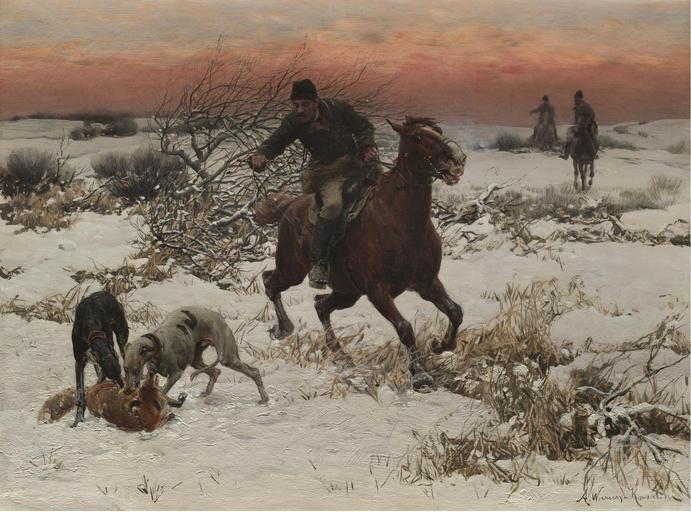 | Keywords: Alfred Wierusz-Kowalski - Myśliwi.jpg Artwork Creator Alfred Wierusz-Kowalski de Jäger en The hunters oil canvas cm 36 5 49 0 http //www sothebys com/de/ecat pdf L07101 html/f/30/L07101-30 pdf by Sotheby's PDF object history Provenance John-Esther Art Gallery Massachusetts<br/>Acquired by the father of the present owner circa 1960; thence by descent credit line signed A Wierusz-Kowalski l r accession number http //www sothebys com/de/catalogues/ecatalogue html/2007/19th-century-european-paintings-including-german-austrian-central-european-paintings-and-the-orientalist-sale-l07101 /r /de/ecat fhtml L07101 html+r m /de/ecat lot L07101 html/30/ Sotheby's PD-old-auto-1923 1915 Paintings by Alfred Wierusz-Kowalski Paintings of hunting men on horseback Oil paintings of dogs Paintings of foxhunting Oil paintings of hunters Oil paintings of horses Images from Sotheby's Hunting by dog Paintings of hunters in snowy landscapes |