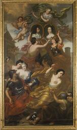 | Keywords: Allegori över konung Karl XIs och drottning Ulrika Eleonoras förening (David Klöcker Ehrenstrahl) - Nationalmuseum - 174870.tif Kung Karl XI Drottning Ulrika Eleonora d ä information field Tre gudinnor Caritas kärleken Constantia beständigheten och Concordia endräkten hålla tillsamman upp två ovala porträttmålningar föreställande Karl XI och Ulrika Eleonora d ä Gudinnorna äro klädda en i mörk rustning hjälm och brunt draperi en i grönvit klänning och ljust lila draperi samt en i gul klänning och blått draperi Konungen och drottningen äro bägge framställda i bröstbild och klädda i hermelin Över porträtten svävar fredens gudinna Pax iklädd blå dräkt och guldgrönt draperi samt med en olivkvist i handen Hon håller porträtten sammanbundna med en gyllene tråd Till vänster sväva två putti med lagerkransar och nedanför gudinnorna leka tre putti I tavlans nedre parti synes till vänster Prudentia klokheten med en spegel i handen och Mansuetudo saktmodigheten i vit dräkt med blå mantel De övertala krigsguden Mars iklädd svart rustning och röd mantel att lämna ifrån sig svärdet Samtidigt låter Mars frivilligt fängsla sig med ett vitt band Nedanför honom ligger krigsfacklan utsläckt och ett spjut avbrutet Till höger fördriver Fidelitas troheten Invidia avunden som en King Charleshund samtidigt nafsar i benet Fidelitas är iklädd en vitblå dräkt och gul mantel Invidia har ormar i håret och är iklädd en smutsvit dräkt och brun mantel I bakgrunden till vänster tillsluta två putti symboliserande fredens barn Janus tempel header Tre gudinnor Caritas kärleken Constantia beständigheten och Concordia endräkten hålla tillsamman upp två ovala porträttmålningar föreställande Karl XI och Ulrika Eleonora d ä Gudinnorna äro klädda en i mörk rustning hjälm och brunt draperi en i grönvit klänning och ljust lila draperi samt en i gul klänning och blått draperi Konungen och drottningen äro bägge framställda i bröstbild och klädda i hermelin Över porträtten svävar fredens gudinna Pax iklädd blå dräkt och guldgrönt draperi samt med en olivkvist i handen Hon håller porträtten sammanbundna med en gyllene tråd Till vänster sväva två putti med lagerkransar och nedanför gudinnorna leka tre putti I tavlans nedre parti synes till vänster Prudentia klokheten med en spegel i handen och Mansuetudo saktmodigheten i vit dräkt med blå mantel De övertala krigsguden Mars iklädd svart rustning och röd mantel att lämna ifrån sig svärdet Samtidigt låter Mars frivilligt fängsla sig med ett vitt band Nedanför honom ligger krigsfacklan utsläckt och ett spjut avbrutet Till höger fördriver Fidelitas troheten Invidia avunden som en King Charleshund samtidigt nafsar i benet Fidelitas är iklädd en vitblå dräkt och gul mantel Invidia har ormar i håret och är iklädd en smutsvit dräkt och brun mantel I bakgrunden till vänster tillsluta två putti symboliserande fredens barn Janus tempel 1692 Oil on canvas Olja på duk Size cm 194 dager354 Institution Nationalmuseum Stockholm Drottningholms slott Signerad Dd Klöcker Ehrenstrahl A o 1692 ovanför Ividias huvud accession number 174870 NMDrh 128 place of creation Q34 Linn Ahlgren / Nationalmuseum Nationalmuseum Stockholm cooperation project Licensed-PD-Art PD-old-auto PD-Nationalmuseum_Stockholm 1698 Media contributed by Nationalmuseum Stockholm 2016-10 Media contributed by Nationalmuseum Stockholm connect to wikidata item Paintings in the Nationalmuseum Stockholm Paintings at Royal Domain of Drottningholm Charles XI of Sweden Ulrica Eleanor Swedish queen 1680 David Klöcker Ehrenstrahl |