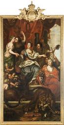 Keywords: Allegori över konung Karl XIs fredliga regeringr (David Klöcker Ehrenstrahl) - Nationalmuseum - 174872.tif I mitten på en tron under ett rött draperi med Karl XI s namnchiffer sitter Svea iklädd diadem klänning av guldtyg samt blå kronströdd hermelinsmantel Hon förenar med sin högra hand Rättvisan och Freden som med en kyss beseglar sin vänskap medan hennes vänstra arm understöds av Försiktigheten vilken håller en spegel i handen och åtföljd av Beständigheten hållande i en kolonn Vid Sveas fötter sitter till höger Välmågan i rödgul klänning och röd mantel hållande ett ymnighetshorn bakom henne skymter ett lejon lekande med fredens fyra små barn I förgrunden ett annant lejon som tuggar sönder krigiska emblem i bakgrunden till höger en utblick mot ett hörn av Stockholms slott invid vilket skymta fanor och skeppsmaster header I mitten på en tron under ett rött draperi med Karl XI s namnchiffer sitter Svea iklädd diadem klänning av guldtyg samt blå kronströdd hermelinsmantel Hon förenar med sin högra hand Rättvisan och Freden som med en kyss beseglar sin vänskap medan hennes vänstra arm understöds av Försiktigheten vilken håller en spegel i handen och åtföljd av Beständigheten hållande i en kolonn Vid Sveas fötter sitter till höger Välmågan i rödgul klänning och röd mantel hållande ett ymnighetshorn bakom henne skymter ett lejon lekande med fredens fyra små barn I förgrunden ett annant lejon som tuggar sönder krigiska emblem i bakgrunden till höger en utblick mot ett hörn av Stockholms slott invid vilket skymta fanor och skeppsmaster 1693 Oil on canvas Olja på duk Size cm 205 dager359 Institution Nationalmuseum Stockholm Drottningholms slott Signerad Dd Klöcker Ehrenstrahl 1695 till höger accession number 174872 NMDrh 130 place of creation Q34 Linn Ahlgren / Nationalmuseum Nationalmuseum Stockholm cooperation project Licensed-PD-Art PD-old-auto PD-Nationalmuseum_Stockholm 1698 Media contributed by Nationalmuseum Stockholm 2016-10 Media contributed by Nationalmuseum Stockholm connect to wikidata item Paintings in the Nationalmuseum Stockholm Paintings at Royal Domain of Drottningholm David Klöcker Ehrenstrahl