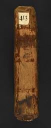 | Keywords: Allegoriae super tabernaculum Moysi and Allegoriae super Leviticum - Spine (Add ms 82947).jpg  Style Frame Foliage Bird motif Floral Stag; Caption Spine; Colour Red/brown; Edge Unspecified exhibition history Decorative Technique Tooled in blind; Cover Material Wood Leather unspecified Original 12th-century binding of panelled red-brown leather over bevelled wooden boards tooled in blind within a ruled framework the front cover with an outer border formed by the repeated use of two tools with birds and an inner border of two foliate tools central compartment with four registers with the double impression of a stag top and bottom St Peter and flower heads at all interstices; the back cover with outer border with the repeated use of tools with Luke's winged ox and a bird beneath an angle an inner border with a two-headed grotesque and a prancing deer central compartment with two vertical tendrils flower heads at interstices remnant of one strap small losses of leather at upper front joint and top edge of front cover and from centre of back cover outer corners very slightly worn six tiny wormholes in front cover and one in back lacking two clasps and pins and upper spine tab Parchment label on back cover with the title De mistica exposicone sacrificiorum' in black ink and paper pressmark label '413' at the head of the spine object history Text 12c; Austria; Unspecified object type Cc-zero place of creation Binding France place of discovery Unspecified British Library image http //www bl uk/catalogues/bookbindings/LargeImage aspx RecordId 020-000018519 ImageId ImageId 57144 Copyright BL Allegoriae super tabernaculum Moysi and Allegoriae super Leviticum Uploaded with GWToolset Allegoriae super tabernaculum Moysi and Allegoriae super Leviticum - Spine Add ms 82947 http //www webarchive org uk/bldatasets/bindings/add_ms_82947_fbspi jpg 12th-century bookbinding British Library Additional Manuscripts British Library Bookbindings Taken with Phase One P45+ |
