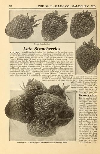 | Keywords: Allen's book of berries (16364334796).jpg 36 <br> THE W F ALLEN CO SALISBURY MD <br> Aroma Strawberries <br> Late Strawberries <br> A ROMA n ° stan dard variety that has been on the market a good <br> - many years and seems to be gaining in popularity all the time <br> We often receive letters from customers saying that new varieties may be <br> good but Aroma is good enough for me Mr Alonzo Stewart of Edwards <br> County Illinois says I have never been deceived in your plants I can <br> truthfully say that the Aroma is the best berry I have ever grown I always <br> recommend your plants to my friends The foliage is dark green and of a <br> spreading habit It is a perfect-flowering variety and as a pollenizer of pistillate <br> varieties of its season it is unexcelled Mr Snyder of Indiana planted Aroma <br> and Fendall together and got a crop of 15 000 quarts of fancy berries per acre <br> It has a very long picking season The blossoms begin to open medium early <br> and continue until late The berries are rich in color large in size and deli- <br> ciously aromatic in flavor Through Arkansas Missouri Tennessee and in <br> many other sections it is probably the most widely grown variety as a fancy <br> market berry It has a handsome green cap which makes it show <br> / up well in the package The berries are firm in texture and solid <br> nough to make an excellent shipping berry Plant Aroma alone or <br> with Fendall Hustler Sample <br> Haverland and other fancy pis- <br> tillate varieties Aroma is a <br> money-making berry and we <br> would like to see it <br> grown more widely <br> Price 3 50 per 1 000 <br> Brandywine <br> This is another most <br> popular late variety <br> for tropical and semi- <br> tropical sections We <br> especially recommend <br> this for Bermuda <br> Cuba the Pacific coast <br> states and the Gulf <br> states At the same time <br> it is a valuable variety <br> in the North where it <br> originated The plant <br> is healthy and vigorous <br> and produces a fine <br> crop of large hand- <br> some fruit which usu- <br> ally brings more than <br> the average price We <br> have a fine stock of <br> Brandywine plants <br> this season and hope <br> to be able to fill all <br> orders The picture on <br> the left shows the fine <br> shape and large size <br> Brandywine A most popular late variety both Norm and South Price 3 50 per t 000 43767892 148699 77584 Page 36 Text http //www biodiversitylibrary org/page/43767892 1917 10 5962/bhl title 77584 Allen Co Salisbury Md ; Henry G Gilbert Nursery and Seed Trade Catalog Collection Biodiversity Heritage Library Allen's book of berries 1917 Garden Stories Allen Co Salisbury Md Catalogs Maryland Nurseries Horticulture Nursery stock Salisbury Strawberries U S Department of Agriculture National Agricultural Library bhl page 43767892 dc identifier http //biodiversitylibrary org/page/43767892 bhlGardenStories BHLinbloom allen co salisbury md nurseries horticulture u s department of agriculture national agricultural library bhlgardenstories bhlinbloom Information field Flickr posted date ISOdate 2015-01-28 Check categories 2015 August 24 CC-BY-2 0 BioDivLibrary https //flickr com/photos/61021753 N02/16364334796 2015-08-24 06 50 43 cc-by-2 0 PD-old-70-1923 Allen's book of berries Photos uploaded from Flickr by Fæ using a script |