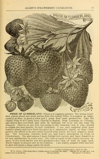 Keywords: Allen's strawberry catalogue for 1900 (16544722386).jpg of Pride of <br> Cumberland The past season I have fruited this variety and have found it to <br> be very satisfactory in every way I'lie -ruit is equal to the xandy in every re- <br> spect is one week earlier and will produce a fine crop of fruit on high land <br> where Gandy is almost sure to be a failure I am highly pleased with this ber- <br> ry and will plant a large patch for fruit <br> W F Allen ” The strawber <br> great care in packinK- <br> Cuf-t-T \iunty khi April is 1S <br> ¢y plants caino yiv-tontny all right Thanks lor ox ras anil jlie <br> Re poctriilly Maruarol S Tiu-kor 43881334 149732 78361 Page 17 Text http //www biodiversitylibrary org/page/43881334 1900 10 5962/bhl title 78361 Allen Co Salisbury Md ; Henry G Gilbert Nursery and Seed Trade Catalog Collection NameFound Louisana Biodiversity Heritage Library Allen's strawberry catalogue for 1900 Garden Stories Allen Co Salisbury Md Catalogs Maryland Nurseries Horticulture Nursery stock Salisbury Strawberries U S Department of Agriculture National Agricultural Library bhl page 43881334 dc identifier http //biodiversitylibrary org/page/43881334 bhlGardenStories Fruit Pride of Cumberland BHLinbloom allen co salisbury md nurseries horticulture u s department of agriculture national agricultural library bhlgardenstories pride of cumberland bhlinbloom Information field Flickr posted date ISOdate 2015-02-18 CC-BY-2 0 BioDivLibrary https //flickr com/photos/61021753 N02/16544722386 2015-08-24 22 50 52 cc-by-2 0 PD-old-70-1923 Allen's strawberry catalogue for 1900 Photos uploaded from Flickr by Fæ using a script |