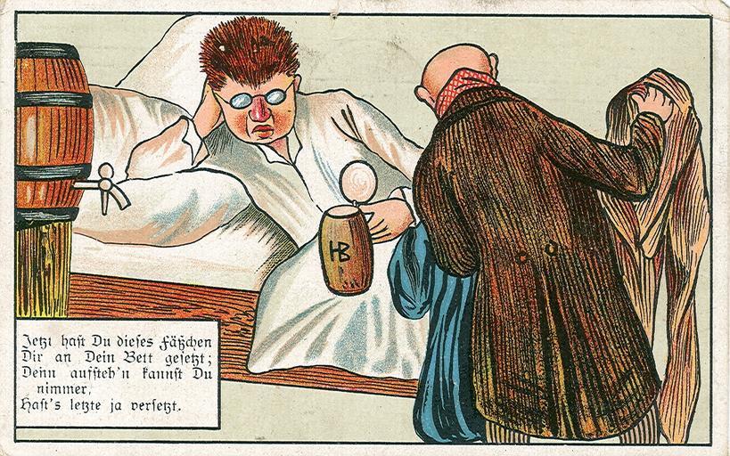 | Keywords: Alles versetzt.jpg en Postcard dated 30 12 1913 German poem Now you have put your last barrel of beer next to your bed; you can´t stand up because you have pawned your last cloth de Postkarte datiert 30 12 1913 Deutsches Gedicht Jetzt hast du dieses Fäßchen Dir an Dein Bett gesetzt denn aufsteh´n kannst Du nimmer hast´s letzte ja versetzt private collection of Wolfgang Sauber Xenophon Creator Unknown 1913 PD-1923 anonymous-EU 1913 cartoons Humorous postcards of Germany Drunken people in art Pawnbrokers Beer drinking in art |
