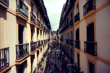 Keywords: alley mediterranean italy france europe historic city town narrow houses balconies buildings architecture exterior residential urban apartments balcony windows street people crowd walking pedestrians