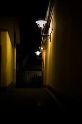 Keywords: alley road lantern night photograph street lamp street lighting dark street secret scary accommodation empty