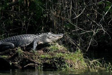 Keywords: alligator water sunning bank shore reptile swamp wildlife gator outdoors animal nature predator resting amphibian wild portrait