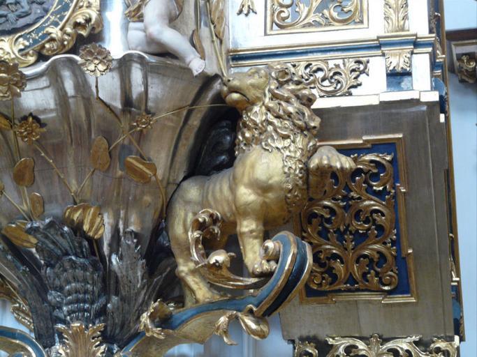 | Keywords: Allmannshofen Kloster holzen 0030.JPG Kloster Holzen ist ein ehemaliges Kloster der Benediktinerinnen in Allmannshofen in Bayern in der Diözese Augsburg <br> Decorations on the Baroque pulpit Holzen Abbey is a Benedictine abbey near the village of Allmannshofen in Bavaria Germany Own Mattana 2009-04-08 Images by Mattana-Allmannshofen Germany Kloster Holzen pulpit Statues of lions in Bavaria Lion of Saint Mark | ||||