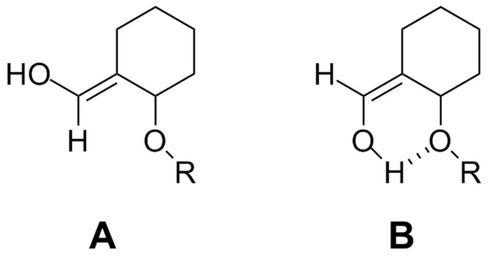 | Keywords: Allylic strain and hydrogen bonding.png chemical en A represents the conformation that would occur in most situations due to allylic strain However as shown in B a hydrogen bond can form that is energetically favorable and cancels the unfavorable allylic strain Thus B is the most stable conformation own Chem540f09grp10 2009-12-01 Hydrogen bonding Allylic strain |