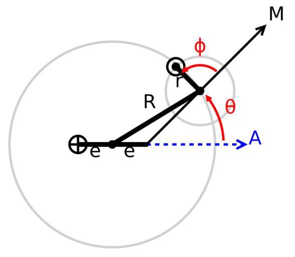 | Keywords: Almagest-planets.svg en Diagram of the geocentric epicyclic planetary model used in the w en Almagest to describe the longitudinal motion of Venus Mars Jupiter and Saturn The Earth is represented by Š• and the planet is represented by ˜‰ The direction A is fixed and the lines labeled e R and r are fixed in length The angles and increase at a constant rate with time The direction M points towards the mean position of the planet own Spacepotato 2011-01-28 Astronomical diagrams Almagest | ||||