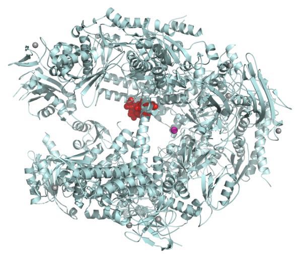 | Keywords: Alpha-Amanitin–RNA polymerase II complex 1K83.png Ribbon diagram of Saccharomyces cerevisiae RNA polymerase II in complex with α-amanitin red Active site magnesium ion visible in pink near center <br>Created using PyMOL http //pymol sourceforge net and GIMP Style and orientation made to match http //www pnas org/content/vol99/issue3/images/large/pq0326646002 jpeg ; Legend lightblue w RNA polymerase II magenta w Active site magnesium ion red -amanitin grey w Zinc ions From PDB entry http //www rcsb org/pdb/cgi/explore cgi pdbId 1K83 1K83 <br>More information Kornberg RD Structural basis of transcription alpha-amanitin-RNA polymerase II cocrystal at 2 8 A resolution Proc Natl Acad Sci USA 99 3 1218 “22 2002 PMID 11805306 10 1073/pnas 251664698 http //www pnas org/cgi/content/full/99/3/1218 Free full text 2007-11-14 Fvasconcellos 21 15 14 November 2007 UTC Transferases Alpha-amanitin |
