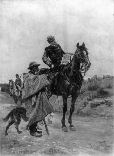 | Keywords: Alphonse de Neuville - Information - Walters 3793.jpg A mounted officer of the Engineers with map in hand is seeking directions from a peasant tending his flock with a dog Another mounted soldier is visible in the background A pen and ink drawing of this subject now in a private collection in Boulogne-sur-Mer dated 1876 was published by Deneuville in Croquis Militaires Paris 1876 plate 16 This drawing may be the Paysan donnant des renseignements à des officiers français listed in the Deneuville Sale Paris 1886 no 256 1876 Oil on canvas cm 46 6 33 accession number 37 93 11568 William T Walters Baltimore prior to 1878 mode of acquisition unknown Henry Walters city Baltimore Walters Art Museum Henry Walters Acquired by William T Walters before 1878 A de Neuville/ 1876 signature/date ~ place of origin France Walters Art Museum license 2D 1876 paintings French army 1870-1914 19th-century paintings of soldiers Alphonse-Marie-Adolphe de Neuville French paintings in the United States Males with horses in art French paintings in the Walters Art Museum People with maps in art 1870s paintings from France |