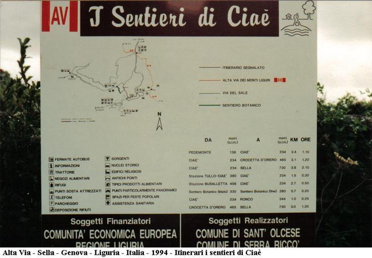 Keywords: Alta Via - Sella - Genova - Italia - 1994 - Itinerari i sentieri di Ciaè.jpg Alta Via - Sella - Genova - Italia - 1994 - Itinerari i sentieri di Ciaè 2005-09-04 own assumed Roger469 Hiking and footpath signs in Italy