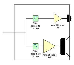 Keywords: Altavoz2VActivoAnalogico.svg Diagrama de bloques de un altavoz activo de dos vías Own 2007-09-09 Jmcalderon Crossover networks loudspeakers Active speakers Loudspeakers Bi-amplification