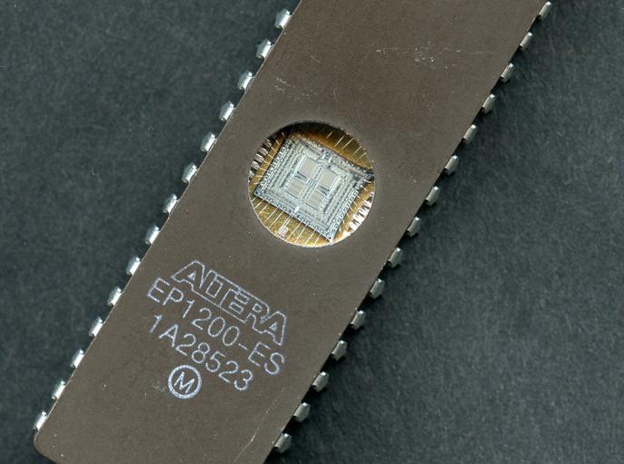 | Keywords: Altera EP1200 Close Up.jpg Altera EP1200 programmable logic device was introduced in 1985 The device used UV erasable technology and could hold the equivalent of 1200 logic gates It came in a 40 pin 600 mil DIP package Intel was a second source Image made by placing the IC on an Epson Perfection V500 Photo scanner Own Swtpc6800 en User Swtpc6800 Michael Holley 2012-06-10 File Altera EP1200 CPLD jpg Altera Close-ups of integrated circuits Complex programmable logic devices Photographs by User Swtpc6800 |