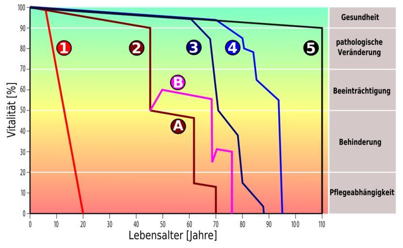 | Keywords: Alternsverlaeufe 01.svg Typische Alternsverläufe <br /> 1 Alterungsprozess bei Progerie vorzeitige Vergreisung <br /> 2 Beschleunigte Alterung durch Risikofaktoren wie Bluthochdruck Nikotin u ä <br /> 2A Ohne therapeutische Maßnahmen <br /> 2B Im Fall einer therapeutischen Maßnahme nach einem Akutereignis beispielsweise eines Schlaganfalls kann eine Besserung der Vitalität und der Lebenserwartung erzielt werden <br /> 3 Eine schnelle Funktionsbeeinträchtigung mit einer langen Phase von Behinderung und Pflegeabhängigkeit wie sie im Fall von Demenz typisch ist <br /> 4 Ein Beispiel für žnormales Altern mit nur geringen Beeinträchtigungen auch in hohem Alter <br /> 5 Ein idealtypischer Alternsverlauf<br /> Daten Source von R F Schmidt F Lang und G Thews Physiologie des Menschen Verlag Springer 2005 ISBN 3-540-21882-3 2005 Seite 945 own inspired by Source 2010-08-12 Kuebi Armin Kübelbeck Gerontology |