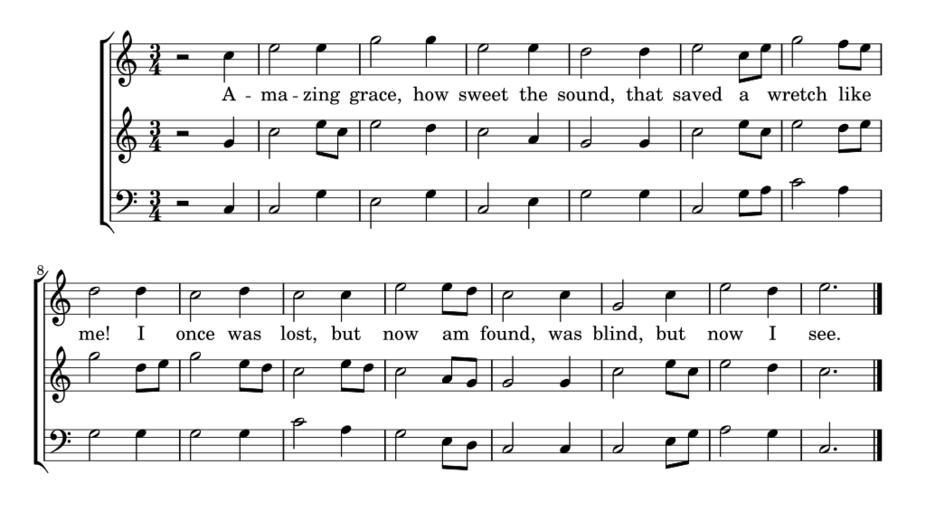 | Keywords: AmazingGrace.svg en «Amazing Grace» as arranged in the en Southern Harmony 1835 own Brian Ammon 2012-09-04 File AmazingGrace png Created with LilyPond Source code <pre> \version 2 15 95 global \key c \major \time 3/4 sopranonotes \relative c r2 c4 e2 e4 g2 g4 e2 e4 d2 d4 e2 c8 e g2 f8 e d2 d4 c2 d4 c2 c4 e2 e8 d c2 c4 g2 c4 e2 d4 e2 \bar sopranowords \lyricmode A -- ma -- zing grace how sweet the sound that saved a _ wretch like _ me I once was lost but now am _ found was blind but now I see altonotes \relative c r2 g4 c2 e8 c e2 d4 c2 a4 g2 g4 c2 e8 c e2 d8 e g2 d8 e g2 e8 d c2 e8 d c2 a8 g g2 g4 c2 e8 c e2 d4 c2 \bar altowords \lyricmode bassnotes \clef bass r2 c4 c2 g4 e2 g4 c2 e4 g2 g4 c2 g8 a c'2 a4 g2 g4 g2 g4 c'2 a4 g2 e8 d c2 c4 c2 e8 g a2 g4 c2 \bar basswords \lyricmode \score \new ChoirStaff << \new Staff << \new Voice soprano << \global \sopranonotes >> \lyricsto soprano \new Lyrics \sopranowords >> \new Staff << \new Voice alto << \global \altonotes >> \lyricsto alto \new Lyrics \altowords >> \new Staff << \new Voice bass << \global \bassnotes >> \lyricsto bass \new Lyrics \basswords >> >> </pre> Amazing Grace Cc-zero |