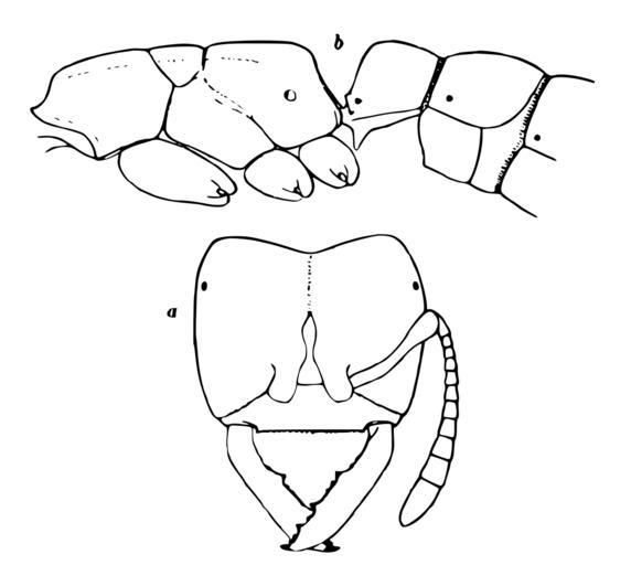 | Keywords: Amblyopone.clarki.-.wheeler.svg Amblyopone clarki worker from West Australia a head dorsal view; b thorax petiole and postpetiole in profile Wheeler 1927 Ants of the genus Amblyopone Erichson Proc Am Acad Arts Sci 62 1-29 http //research amnh org/entomology/social_insects/ants/publications/3386/3386 pdf PDF 1927 W M Wheeler pd-old PD-old Drawings of animals by William Morton Wheeler Drawings of ants | ||||
