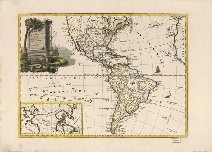 | Keywords: America According to New Geographical Observations, 1787 WDL9872.png Artwork ru Эндасиан Элия fr Endasian Elia en Endasian Elia zh 埃利亚·恩达斯安 pt Endasian Elia ar إليا إنداسيان es Endasian Elia ru Аме ика согласно новым геог афическим наблюдениям 1787 г fr L'Amérique selon les nouvelles observations géographiques 1787 en America According to New Geographical Observations 1787 zh 美洲 图, 自 1787 年的 理新观察 pt América de acordo com as novas observações geográficas 1787 ar القارتان الأمريكيتان وفقاً للمشاهدات الجغرافية الحديثة، 1787 ru В 1717 г молодой а мянский католический священник хита Севастийский ехита из Севастии сов еменный го од Сивас Ту ция 1676 1749 гг основал а мянский бенедиктинский католический монасты ь на ост ове Сан-Ладза о в Венеции хита написал и опубликовал несколько абот кото ые послужили источником вдохновения и интеллектуального воз ождения в последующие века онасты ь стал цент ом а мянского обучения и книгопечатания С еди многочисленных абот напечатанных отцами-мхита истами из Сан-Ладза о были ка ты и геог афические исследования Эта ка та двух Аме ик входит в набо из четы ех ка т континентов созданных Элия Эндасианом в типог афии Сан-Ладза о в 1786 1787 гг Ка тог афический т уд по большей части бази уется на более анних аботах итальянских ка тог афов но названия населенных пунктов и условные обозначения п иведены на а мянском языке fr En 1717 Mékhitar de Sébaste aujourd'hui Sivas en Turquie 1676 1749 jeune prêtre catholique arménien fonda un monastère catholique arménien bénédictin sur l'île de Saint-Lazare à Venise Mékhitar écrivit et publia plusieurs ouvrages qui constituèrent des sources d'inspiration et de renouveau intellectuel pendant les siècles qui suivirent Le monastère devint un centre promouvant les publications et les enseignements arméniens Des cartes et des études géographiques comptent parmi les nombreux ouvrages publiés par les pères mékhitaristes de Saint-Lazare Cette carte de l'Amérique fait partie d'un ensemble de quatre cartes continentales d'Elia Endasian produit à l'imprimerie de Saint-Lazare en 1786 ou 1787 La cartographie repose principalement sur les ouvrages précédents réalisés par les cartographes italiens mais les noms de lieux et les légendes des cartes apparaissent en arménien en In 1717 a young Armenian Catholic priest Mekhitar Sebastatsi Mekhitar of Sebastia present-day Sivas in Turkey 1676 1749 founded a Benedictine Armenian Catholic monastery on the island of San Lazzaro in Venice Mekhitar wrote and published several works that became sources of inspiration and intellectual renewal throughout the centuries that followed The monastery became a center for Armenian learning and publishing Among the many works published by the Mekhitarist fathers of San Lazzaro were maps and geographical studies This map of the Americas is part of a set of four continental maps by Elia Endasian produced at the San Lazzaro press in 1786 87 The cartography is largely based on earlier works by Italian mapmakers but the place-names and the map legends are in Armenian zh 1717 年,年轻的亚美尼亚天主教神父默基塔尔·塞巴斯塔 (Mekhitar Sebastatsi,又称塞巴斯蒂亚 今 其锡瓦斯 的默基塔尔,1676-1749 年) 威尼斯的 拉扎罗岛上修建了 座 笃会的亚美尼亚天主教修道院 默基塔尔曾撰写并发表多部 品,这些 品成为灵感启迪和知 复兴的 源,影响了随后的几个世纪 该修道院后 成为亚美尼亚学习和出版的中心 拉扎罗的默基塔尔会神父们出版的众多 品中 些 图和 理研究著 这张美洲 图是四大洲系列 图中的其中 张,由埃利亚·恩达斯安 Elia Endasian 于 1786 年至 1787 年 拉扎罗出版社出版 图主要以意大利 图制 的早 品为 ,但 名和 图图例 使用亚美尼亚文标注 pt Em 1717 um jovem padre católico da Armênia Mekhitar Sebastatsi Mekhitar da Sebastia atual Sivas na Turquia 1676 1749 fundou um monastério armênio católico beneditino na ilha de São Lázaro em Veneza Mekhitar escreveu e publicou várias obras que tornaram-se fontes de inspiração e renovação intelectual por vários séculos seguintes O monastério tornou-se um centro de aprendizado e publicação da Armênia Dentre as várias obras publicadas pelos padres Mekhitaristas de São Lázaro estavam mapas e estudos geográficos Este mapa das Américas é parte de um conjunto de quatro mapas continentais de Elia Endasian produzido na gráfica de São Lázaro em 1786-1787 A cartografia é amplamente baseada em obras anteriores por cartógrafos italianos mas os nomes de lugares e as legendas do mapa estão em armênio ar في عام 1717، قام قسيس كاثوليكي أرميني شاب، المِخِتار السيباسطاطسي مِخِتار سبسطية سيفاس حالياً، بتركيا 1676 1749 ، بتأسيس دير كاثوليكي أرميني بندكتي على جزيرة سان لاتزارو في البندقية كَتَب المِخِتار عدة أعمال ونشرها، وصارت تلك الأعمال مصادراً للإلهام والتجديد الثقافي على مر القر