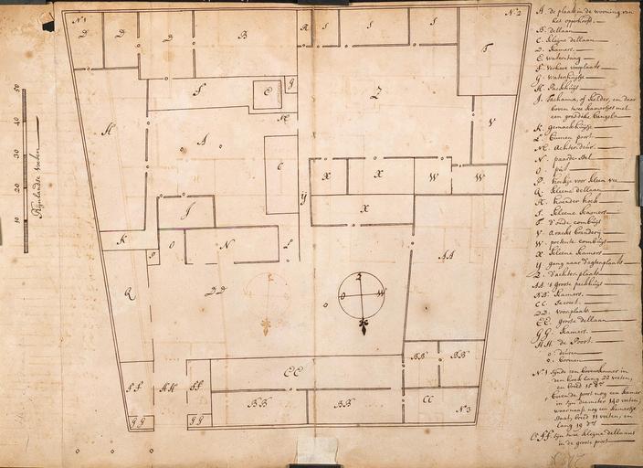 Keywords: AMH-2629-NA Floor plan of the lodge of the Company at Agra.jpg Artwork nl Plattegrond van de loge van de compagnie te Agra nl Titel catalogus Leupe Afbeelding van 's Comps Logie in Agra Legenda A t/m HH Notities verso nr 14; nr fol 272; 499 g R 2 en According to the Leupe catalogue the original title reads Afbeelding van 's Comps Logie in Agra Key A t/m HH Notes on reverse nr 14; nr fol 272; 499 g R 2 Atlas of Mutual Heritage na http //www atlasofmutualheritage nl/en/object/ id 2629 Source at the Atlas of Mutual Heritage - http //www gahetna nl/collectie/archief/inventaris/index/eadid/4 VEL/inventarisnr/880B/level/file Source at the Nationaal Archief en Subjects chart / map / plan warehouse menagerie / stable key compass / dial nl Onderwerpen plattegrond / kaart pakhuis menagerie / stal legenda kompas / windroos en Post this image is related to a VOC trading post called http //www atlasofmutualheritage nl/en/post/ id 390 Agra Inscription - nl circa 1700 nl Anoniem / Anonymous en Anoniem / Anonymous Institution Nationaal Archief nl pen op papier en pen on paper Size cm 39 54 accession number NL-HaNA_4 VEL_880B old number VEL0880B PD-Art-100 Maps of the Dutch East India Company - India 1700 |