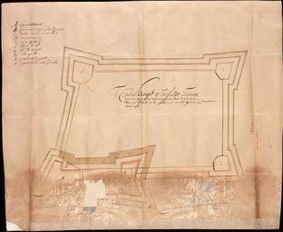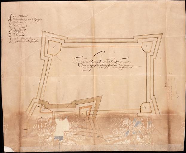Keywords: AMH-5489-NA Plan of Oranje castle on Ternate.jpg Artwork nl Plattegrond van kasteel Oranje op Ternate nl Titel catalogus Leupe NA t Casteel Orangie op 't Eyland Ternate met een project tot vercleyningh Legenda A-K Bijzonderheden het onderste deel van de kaart verkeert in een slechte toestand; het is wel gerestaureerd maar er zitten gaten in de kaart Notities verso Molucco 1653 Caerte van geconcipieerde vercleeningh des Casteels Orangie op't eijlandt Ternate / Behoort by den brief van G van den Boogaerden van 18 jan 1650 fol 842 Portef 1653 III / 909 folionummer in de band / No 35 volgnummer van het stuk in de band ; doorgestreept zijn resp No 8 en No 26 / 648c en Title in the Leupe catalogue NA t Casteel Orangie op 't Eyland Ternate met een project tot vercleyningh Key A-K Particulars the lower part of the map is in a bad condition; it has been restored but there are holes in the map Notes on reverse Molucco 1653 Caerte van geconcipieerde vercleeningh des Casteels Orangie op't eijlandt Ternate / Behoort by den brief van G van den Boogaerden van 18 jan 1650 fol 842 Portef 1653 III / 909 folio number in the volume / No 35 serial number of the item in the volume ; No 8 and No 26 have been crossed out / 648c Atlas of Mutual Heritage na http //www atlasofmutualheritage nl/en/object/ id 5489 Source at the Atlas of Mutual Heritage - http //www gahetna nl/collectie/archief/inventaris/index/eadid/4 VEL/inventarisnr/1311/level/file Source at the Nationaal Archief en Subjects key fortification chart / map / plan nl Onderwerpen legenda vesting plattegrond / kaart en Fort this image is related to a VOC fort called http //www atlasofmutualheritage nl/en/fort/ id 74 fort Ternate Oranje Inscription 'T Casteel Orangie op 't ijlandt Ternate met een project tot vercleijningh doot 't opwerpen van een bolwerck aen d'noordtcant van des Gouverneurs wooningh nl circa 1653 nl Anoniem / Anonymous landmeter / kaartenmaker en Anoniem / Anonymous land surveyor / mapmaker Institution Nationaal Archief nl pen op papier en pen on paper Size cm 39 48 accession number NL-HaNA_4 VEL_1311 old number VEL1311 PD-Art-100 Maps of the Dutch East India Company - Indonesia 1653 Fort Oranje