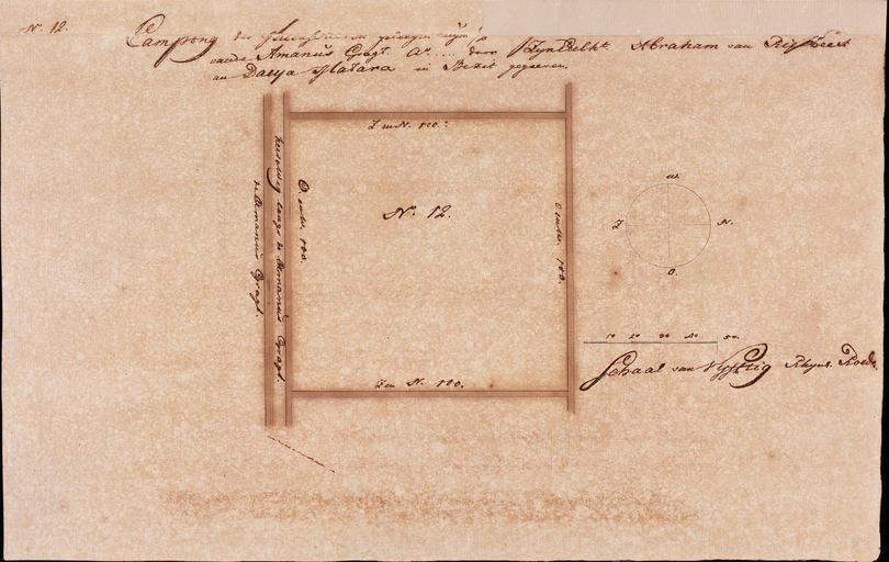 | Keywords: AMH-6046-NA Map of farmlands in the Batavia area, part twelve.jpg Artwork nl Kaart van landerijen in de omgeving van Batavia deel twaalf nl Titel catalogus Leupe NA Campong der Macassaeren geleegen ruijm 1/4 uur gaans buijten en bewesten deser stadt aan de noordzijde van de Amanusgragt a door Z E Abraham van Riebeek aan Saeija Matara in bezit gegeeven Het kaartje maakt deel uit van een verzameling van 24 kaartjes en is genummerd no 12 linksboven en in het midden N 12 De nummers 11 20 21 en 26 ontbreken Rechts een kompas Z;W;N;O en schaalverdeling Schaal van Vijftig Rhijns Roeden In het midden een plattegrond van wegen en grachten zoals heereweg langs de Armanus Gragt de Armanus Gragt en Title in the Leupe catalogue NA Campong der Macassaeren geleegen ruijm 1/4 uur gaans buijten en bewesten deser stadt aan de noordzijde van de Amanusgragt a door Z E Abraham van Riebeek aan Saeija Matara in bezit gegeeven The map is part of a collection of 24 charts and is numbered no 12 top left and in the centre N 12 The numbers 11 20 21 and 26 are missing To the right a compass Z;W;N;O and scale Schaal van Vijftig Rhijns Roeden In the centre a map of roads and canals comprising heereweg langs de Armanus Gragt de Armanus Gragt Atlas of Mutual Heritage na http //www atlasofmutualheritage nl/en/object/ id 6046 Source at the Atlas of Mutual Heritage - http //www gahetna nl/collectie/archief/inventaris/index/eadid/4 VELH/inventarisnr/452 12/level/file Source at the Nationaal Archief en Subjects compass / dial chart / map / plan estate / plantation nl Onderwerpen kompas / windroos plattegrond / kaart landerij / plantage en Post this image is related to a VOC trading post called http //www atlasofmutualheritage nl/en/post/ id 328 Jakarta Inscription Campong der Macassaeren geleegen ruijm 1/4 tekst ontbreekt vande Amanus Gragt A door Zijn Edelht Abraham van Riebeek en Daeya Matara in Bezit gegeeven nl between 1689 1709 nl Anoniem / Anonymous en Anoniem / Anonymous Institution Nationaal Archief nl pen en penseel op papier en pen and brush on paper Size cm 27 42 accession number NL-HaNA_4 VELH_452 12 old number VELH0452_12 PD-Art-100 Maps of the Dutch East India Company - Indonesia |