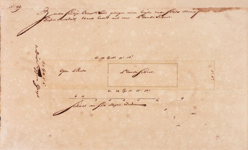 | Keywords: AMH-6053-NA Map of farmlands in the Batavia area, part nineteen.jpg Artwork nl Kaart van landerijen in de omgeving van Batavia deel negentien nl Titel catalogus Leupe NA Zeeker stukje Compagnie's land geleegen eeven buijten deese stadts nieuw poort in de zuijder voorstadt thans beset met eene planke school Het kaartje maakt deel uit van een verzameling van 24 kaartjes en is genummerd no 19 linksboven en in het midden N 19 De nummers 11 20 21 en 26 ontbreken Doorsnede van Planke School Open Plaats Onder is een kompas N O Z W en een schaalverdeling Schaal van Ses Rhyns Roeden en Title in the Leupe catalogue NA Zeeker stukje Compagnie's land geleegen eeven buijten deese stadts nieuw poort in de zuijder voorstadt thans beset met eene planke school The map is part of a collection of 24 charts and is numbered no 19 top left and in the centre N 19 The numbers 11 20 21 and 26 are missing Cross-section of Planke School Open Plaats Bottom is a compass N O Z W and a scale Schaal van Ses Rhyns Roeden Atlas of Mutual Heritage na http //www atlasofmutualheritage nl/en/object/ id 6053 Source at the Atlas of Mutual Heritage - http //www gahetna nl/collectie/archief/inventaris/index/eadid/4 VELH/inventarisnr/452 19/level/file Source at the Nationaal Archief en Subjects cross-section / profile school estate / plantation chart / map / plan building nl Onderwerpen doorsnede / profiel school landerij / plantage plattegrond / kaart gebouw en Post this image is related to a VOC trading post called http //www atlasofmutualheritage nl/en/post/ id 328 Jakarta Inscription Zeeker Stukje Comp Land geleegen eeven buyten deese Stadts Nieuw poort in de Zuyder Voorstadt thans beset met eene Planke School nl between 1689 1709 nl Anoniem / Anonymous en Anoniem / Anonymous Institution Nationaal Archief nl pen en penseel op papier en pen and brush on paper Size cm 26 5 43 accession number NL-HaNA_4 VELH_452 19 old number VELH0452_19 PD-Art-100 Maps of the Dutch East India Company - Indonesia |