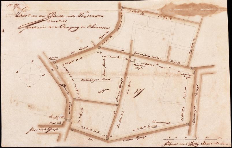 | Keywords: AMH-6058-NA Map of farmlands in the Batavia area, part twenty seven.jpg Artwork nl Kaart van landerijen in de omgeving van Batavia deel zevenentwintig nl Titel catalogus Leupe NA Kaart van een gedeelte van de zuijdwestvoorstadt gedestineerd tot de campong der Chineesen Het kaartje maakt deel uit van een verzameling van 24 kaartjes en is genummerd no 27 linksboven en in het midden N 27 De nummers 11 20 21 en 26 ontbreken De afbeelding toont een plattegrond van onder meer verschillende wegen grachten wachthuizen de Revier Crocot de Groote Revier Stadt buyte Gragt Bacharagt Gragt Europeese Wagt Links een kompas N O Z W en rechtsonder een schaalverdeling Schaal van Vijftig Rhijns Roeden en Title in the Leupe catalogue NA Kaart van een gedeelte van de zuijdwestvoorstadt gedestineerd tot de campong der Chineesen The map is part of a collection of 24 charts and is numbered no 27 top left and in the centre N 27 The numbers 11 20 21 and 26 are missing The image shows a map of various roads canals and sentry posts de Revier Crocot de Groote Revier Stadt buyte Gragt Bacharagt Gragt Europeese Wagt Left a compass N O Z W and a scale Schaal van Vijftig Rhijns Roeden Atlas of Mutual Heritage na http //www atlasofmutualheritage nl/en/object/ id 6058 Source at the Atlas of Mutual Heritage - http //www gahetna nl/collectie/archief/inventaris/index/eadid/4 VELH/inventarisnr/452 27/level/file Source at the Nationaal Archief en Subjects estate / plantation bridge chart / map / plan compass / dial building guard house / tollbooth nl Onderwerpen landerij / plantage brug plattegrond / kaart kompas / windroos gebouw tolhuis / wachthuis en Post this image is related to a VOC trading post called http //www atlasofmutualheritage nl/en/post/ id 328 Jakarta Inscription Vaart van een Gedeelte vande Zuyd Westen Voorstadt gedestineerd tot de Campong den Chineesen nl between 1689 1709 nl Anoniem / Anonymous en Anoniem / Anonymous Institution Nationaal Archief nl pen en penseel op papier en pen and brush on paper Size cm 26 5 42 accession number NL-HaNA_4 VELH_452 27 old number VELH0452_27 PD-Art-100 Maps of the Dutch East India Company - Indonesia |