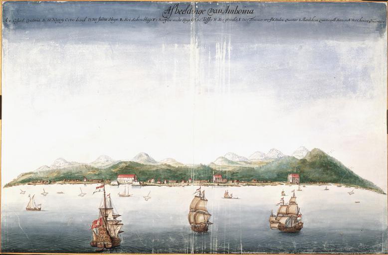 Keywords: AMH-6130-NA View of Ambon.jpg Artwork nl Aanzicht op Ambon nl Titel catalogus Leupe NA Gezicht op de stad Amboina van de zeezijde De afbeelding toont een havenplaats met op de achtergrond enkele bergen Op de rede liggen grote Oostindiƫvaarders die de Nederlandse vlag voeren Bovenin onder het opschrift Afbeeldinge van Amboina een verklaring van de letters A-N en Title in the Leupe catalogue NA Gezicht op de stad Amboina van de zeezijde The picture depicts a port town with mountains in the background On the roadstead East Indiamen lie at anchor flying the Dutch flag Top below the inscription Afbeeldinge van Amboina is a key to the letters A-N Atlas of Mutual Heritage na http //www atlasofmutualheritage nl/en/object/ id 6130 Source at the Atlas of Mutual Heritage - http //www gahetna nl/collectie/archief/inventaris/index/eadid/4 VELH/inventarisnr/619 16/level/file Source at the Nationaal Archief en Subjects shipyard house anchorage / pier / harbour ship / vessel church / parsonage hospital / lazaret fortification building assembly hall / town hall survey / view flora nl Onderwerpen scheeps- / timmerwerf huis / woonhuis rede / haven / pier schip / vaartuig kerk / pastorie ziekenhuis / lazaret vesting gebouw raadhuis / stadhuis overzicht / aanzicht flora en Post this image is related to a VOC trading post called http //www atlasofmutualheritage nl/en/post/ id 316 Ambon Inscription Afbeeldinge van Amboina nl circa 1665 Creator Johannes Vingboons nl Johannes Vingboons landmeter / kaartenmaker en Johannes Vingboons land surveyor / mapmaker Institution Nationaal Archief nl aquarel/waterverf op papier en watercolour on paper Size cm 44 67 accession number NL-HaNA_4 VELH_619 16 old number VELH0619 16 PD-Art-100 Dutch East India Company 1665 Sailing ships of the Netherlands |