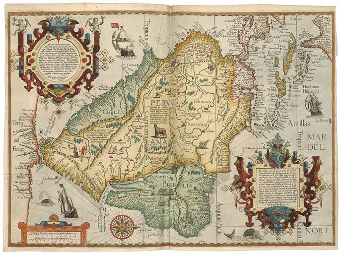 | Keywords: AMH-6604-KB Map of South America.jpg Artwork nl Kaart van Zuid Amerika nl Kaart van Zuid Amerika De kaart is een kwartslag gedraaid het noorden ligt rechts Middenonder is een zeemonster te zien Even boven de windroos zijn martelingen afgebeeld Afbeeldinghe van alle de zee-custen des gheheelen Zuyderschen deels van America genaemt Peruviana beginnende van R de la Plata langes de custen van Brasilien Paria ende t'gulden Castilia met alle die eijlanden Antillas ghenaempt Hispaniola ende Cuba tot C de la Florida toe midts-gaders d'engte des landts tuschen Panama ende Nombre de Dios alle de custen ende t'landt van t'gulden Peru met zijn hooftstadt Cusco ende bequaem-hauen Lima ghenaempt Item de custen van Chile ende t' Canael ofte engte tuschen t'landt der Patagonen ende Terra del Fuego midts-gaders alle de havenen eijlanden clippe sanden diepten ende ondiepten met de waarachtighe streckinghe van dien alles seer correctelijck ghetrocken en na d'allerbeste Spaensche pas-caerten ouersien ende verbetert Delineatio omnium orarum totius Australis partis Americae dictae Peruvianae à R de la Plata Brasiliam Pariam Castellam auream unà cùm omnibus Insulis Antillas dictis Hispaniolam item Cubam comprehendentis usq ad promont floridae vulgio cabo de la florida Item Isthmi inter Panamam Nombre de dios Terrae Peru ariferae cum eius metropoli Cusco comodisimo portu Limae Orarum etiam Chilae freti inter terram Patagonum terram del fuego vulgò Estrecho de Fernando Magallanes Et omnium portuum Insularum scopulorum pulvinorum vadorum tractusq ventorum ex optimis Lusitanicis cartis hydrogrphicis delineata atq emendata en Map of South America The map has been rotated 90 degrees north is situated on the right A sea monster is depicted bottom centre Just above the compass scenes of torture are depicted Afbeeldinghe van alle de zee-custen des gheheelen Zuyderschen deels van America genaemt Peruviana beginnende van R de la Plata langes de custen van Brasilien Paria ende t'gulden Castilia met alle die eijlanden Antillas ghenaempt Hispaniola ende Cuba tot C de la Florida toe midts-gaders d'engte des landts tuschen Panama ende Nombre de Dios alle de custen ende t'landt van t'gulden Peru met zijn hooftstadt Cusco ende bequaem-hauen Lima ghenaempt Item de custen van Chile ende t' Canael ofte engte tuschen t'landt der Patagonen ende Terra del Fuego midts-gaders alle de havenen eijlanden clippe sanden diepten ende ondiepten met de waarachtighe streckinghe van dien alles seer correctelijck ghetrocken en na d'allerbeste Spaensche pas-caerten ouersien ende verbetert Delineatio omnium orarum totius Australis partis Americae dictae Peruvianae à R de la Plata Brasiliam Pariam Castellam auream unà cùm omnibus Insulis Antillas dictis Hispaniolam item Cubam comprehendentis usq ad promont floridae vulgio cabo de la florida Item Isthmi inter Panamam Nombre de dios Terrae Peru ariferae cum eius metropoli Cusco comodisimo portu Limae Orarum etiam Chilae freti inter terram Patagonum terram del fuego vulgò Estrecho de Fernando Magallanes Et omnium portuum Insularum scopulorum pulvinorum vadorum tractusq ventorum ex optimis Lusitanicis cartis hydrogrphicis delineata atq emendata Atlas of Mutual Heritage kb http //www atlasofmutualheritage nl/en/object/ id 6604 Source at the Atlas of Mutual Heritage en Subjects fauna banderole / cartouche / ornamentation chart / map / plan ship / vessel flora compass / dial nl Onderwerpen fauna banderol / cartouche / versiering plattegrond / kaart schip / vaartuig flora kompas / windroos en Post this image is related to a WIC trading post called http //www atlasofmutualheritage nl/en/post/ id 1052 Salvador Inscription Afbeeldinghe van alle de zee-custen des gheheelen Zuyderschen deels van America genaemt Peruviana author Arnoldus Florentius à Langren Author scalptor nl circa 1596 Creator Arnoldus Florentius Langren Creator Cornelis Claesz nl Arnoldus Florentius Langren graveur / etser Cornelis Claesz uitgever en Arnoldus Florentius Langren engraver / etcher Cornelis Claesz publisher Institution Koninklijke Bibliotheek nl ingekleurde gravure op papier en coloured engraving on paper Size cm 52 5 42 5 accession number 1702 B 4 deel II p 16 PD-Art-100 1596 |