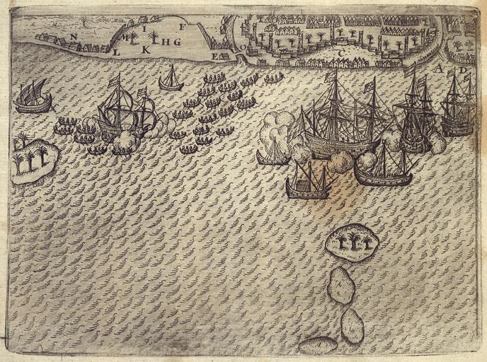 | Keywords: AMH-6609-KB Bird's eye view of the roadstead at Bantam with De Houtman's fleet.jpg Artwork nl Vogelvlucht van de rede van Bantam met de vloot van De Houtman nl Vogelvlucht van de rede van Bantam Legenda ontbreekt De vloot van Cornelis de Houtman wordt aangevallen door de inwoners van Bantam en de Portugezen maar verslaat deze 1596 Cf Universiteitsbibliotheek Universiteit van Amsterdam inv nr OF 63 778 9 en Bird's eye view of the Bantam roadstead There is no key The fleet of Cornelis de Houtman is attacked by the inhabitants of Bantam and the Portuguese but defeats them 1596 Cf Universiteitsbibliotheek Universiteit van Amsterdam inv nr OF 63 778 9 Atlas of Mutual Heritage kb http //www atlasofmutualheritage nl/en/object/ id 6609 Source at the Atlas of Mutual Heritage en Subjects survey / view bird's-eye view / elevation elevation / bird's-eye view fence / kraal ship / vessel anchorage / pier / harbour Person flora blockade / naval battle Asians Africans nl Onderwerpen overzicht / aanzicht vogelvlucht / opstand opstand / vogelvlucht omheining / kraal schip / vaartuig rede / haven / pier Persoon flora blokkade / zeeslag Aziaten Afrikanen circa 1598 Creator Barent Langenes nl Anoniem / Anonymous graveur / etser Barent Langenes uitgever en Anoniem / Anonymous engraver / etcher Barent Langenes publisher Institution Koninklijke Bibliotheek nl gravure op papier en engraving on paper Size cm 18 5 14 accession number 1700 C 8 PD-Art-100 Dutch East India Company 1598 |
