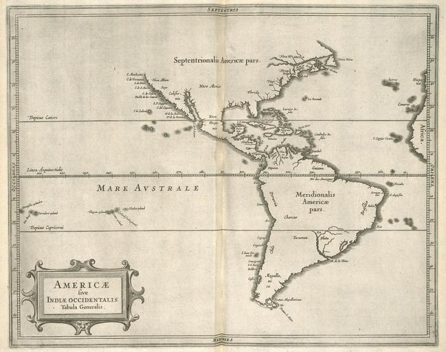 Keywords: AMH-6691-KB Map of North and South America.jpg Artwork nl Kaart van Noord- en Zuid-Amerika nl Kaart van Noord en Zuid-Amerika Americae sive Indiae occidentalis Tabula Generalis Als gevolg van een rekenfout is de Atlantische Oceaan te klein en Map of North and South America Americae sive Indiae occidentalis Tabula Generalis Due to an arithmetical error the Atlantic Ocean is depicted too small Atlas of Mutual Heritage kb http //www atlasofmutualheritage nl/en/object/ id 6691 Source at the Atlas of Mutual Heritage en Subjects chart / map / plan banderole / cartouche / ornamentation nl Onderwerpen plattegrond / kaart banderol / cartouche / versiering en Post this image is related to a WIC trading post called http //www atlasofmutualheritage nl/en/post/ id 1056 Castro Inscription Americae sive Indiae occidentalis Tabula Generalis nl circa 1630 Creator B Elsevier Creator I Elsevier nl B Elsevier uitgever I Elsevier uitgever Anoniem / Anonymous landmeter / kaartenmaker en B Elsevier publisher I Elsevier publisher Anoniem / Anonymous land surveyor / mapmaker Institution Koninklijke Bibliotheek nl gravure op papier en engraving on paper Size cm 36 5 28 5 accession number 36 G 19 eerste kaart PD-Art-100 Maps of the West-Indische Compagnie 1630 |
