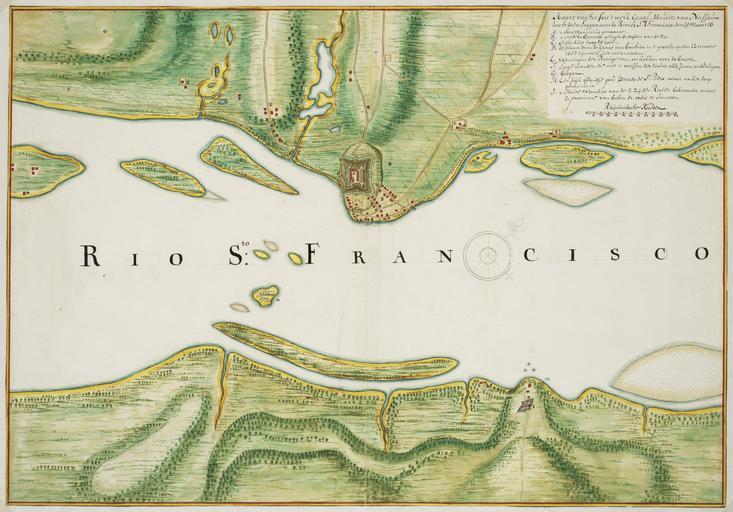 Keywords: AMH-6782-NA Floor plan of the fort of Mauritius on Rio San Francisco.jpg Artwork nl Plattegrond van het fort Mauritius aan de Rio San Francisco nl Titel catalogus Leupe NA Kaart van het fort twelk graaf Maurits van Nassauw heeft doen leggen aan de rivier Sto Francisco den 29 Maart 16 sic Plattegrond van het fort Mauritius aan de Rio San Francisco Kaart van het fort 't welk Graaf Murits van Nassauw heeft doen Leggen aan de Rivier S ta Francisco den 29 Maart 16 Legenda A 't Fort Mouritius genaamt / B 't stedeke Oponedo gelegen 6 mijlen van de zee C Stijle Klip hoog 89 voet / D de plaats daar de graaf van Banhola in 't gevecht op den 12 maart 1637 zijn volk liet overzetten / E Woningen der Portugezen en hokken voor de beesten / F Lage Landen die met 't wassen der rievier alle jaren onderlopen / G Bergen / H Een stijl ijlandje gen t Pinedo de S t Pedro waar na het dorp genaamt is / I 't Houte Wambus aan de z zijde der Rivier behorende onder de provintie van bahia de todos os Sanctos Bijzonderheid de kaart hoort bij de Atlas Vingboons Cf Koninklijke Bibliotheek Den Haag inv nr 1043 B 14 na p 42 no 16 en Title in the Leupe catalogue National Archives Kaart van het fort twelk graaf Maurits van Nassauw heeft doen leggen aan de rivier Sto Francisco den 29 Maart 16 sic Floor plan of the fort of Mauritius on the Rio San Francisco Kaart van het fort 't welk Graaf Murits van Nassauw heeft doen Leggen aan de Rivier S ta Francisco den 29 Maart 16 Key A 't Fort Mouritius genaamt / B 't stedeke Oponedo gelegen 6 mijlen van de zee C Stijle Klip hoog 89 voet / D de plaats daar de graaf van Banhola in 't gevecht op den 12 maart 1637 zijn volk liet overzetten / E Woningen der Portugezen en hokken voor de beesten / F Lage Landen die met 't wassen der rievier alle jaren onderlopen / G Bergen / H Een stijl ijlandje gen t Pinedo de S t Pedro waar na het dorp genaamt is / I 't Houte Wambus aan de z zijde der Rivier behorende onder de provintie van bahia de todos os Sanctos Noteworthy is that this map belongs to the Vingboons Atlas Cf Koninklijke Bibliotheek The Hague inv nr 1043 B 14 after p 42 no 16 Atlas of Mutual Heritage na http //www atlasofmutualheritage nl/en/object/ id 6782 Source at the Atlas of Mutual Heritage - http //www gahetna nl/collectie/archief/inventaris/index/eadid/4 VELH/inventarisnr/619 79/level/file Source at the Nationaal Archief en Subjects key compass / dial fortification chart / map / plan nl Onderwerpen legenda kompas / windroos vesting plattegrond / kaart en Post this image is related to a WIC trading post called http //www atlasofmutualheritage nl/en/post/ id 1049 Penedo Inscription Kaart van het fort 't welk Graaf Murits van Nassauw heeft doen Leggen aan de Rivier S ta Francisco den 29 Maart 16 nl circa 1665 Creator Johannes Vingboons nl Johannes Vingboons landmeter / kaartenmaker en Johannes Vingboons land surveyor / mapmaker Institution Nationaal Archief nl aquarel/waterverf op papier en watercolour on paper Size cm 43 62 accession number NL-HaNA_4 VELH_619 79 old number VELH0619 79 PD-Art-100 Maps of the West-Indische Compagnie 1665 |