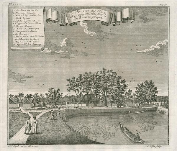 | Keywords: AMH-7043-KB View of Rijswijk Fort.jpg Artwork nl Gezicht op fort Rijswijk nl Gezicht op fort Rijswijk Ein Prospect des Posts Reysweyck eine Stunde von Batavia gelegen Linksboven No XXXIII Rechtsboven pag 97 Legenda a die Mauer um den Post / b Thor oder Eingang / c Wacht-Hauss worinn das Volck logieret / d Gatatter u andere Bäume / e Klapper oder Coccus-Gärten / f Pysang-Bäume / g Malaysche Wohnungen / h Europaeische-Gärten / i die Riviere / k Brücke welche über die Riviere nach denen Gärten führet / l Weg nach Nort-Weyck / m Weg nach Passar Tanawang en View of Fort Rijswijk Ein Prospect des Posts Reysweyck eine Stunde von Batavia gelegen Top left No XXXIII Top right pag 97 Key a die Mauer um den Post / b Thor oder Eingang / c Wacht-Hauss worinn das Volck logieret / d Gatatter u andere Bäume / e Klapper oder Coccus-Gärten / f Pysang-Bäume / g Malaysche Wohnungen / h Europaeische-Gärten / i die Riviere / k Brücke welche über die Riviere nach denen Gärten führet / l Weg nach Nort-Weyck / m Weg nach Passar Tanawang Atlas of Mutual Heritage kb http //www atlasofmutualheritage nl/en/object/ id 7043 Source at the Atlas of Mutual Heritage en Subjects survey / view fortification flora ship / vessel Person Asians Africans guard house / tollbooth gate fence / kraal bridge garden / ornamental garden nl Onderwerpen overzicht / aanzicht vesting flora schip / vaartuig Persoon Aziaten Afrikanen tolhuis / wachthuis poort omheining / kraal brug tuin / siertuin en Post this image is related to a VOC trading post called http //www atlasofmutualheritage nl/en/post/ id 328 Jakarta Inscription Ein Prospect des Posts Reysweyck eine Stunde von Batavia gelegen author I W Heydt ad viv del 1740 / A Hoffer sculps nl 1740 Creator Johann Wolfgang Heydt Creator Andreas Hoffer Creator Johann Carl Tetschner nl Johann Wolfgang Heydt tekenaar Andreas Hoffer graveur / etser Johann Carl Tetschner uitgever en Johann Wolfgang Heydt draughtsman Andreas Hoffer engraver / etcher Johann Carl Tetschner publisher Institution Koninklijke Bibliotheek nl koperdruk op papier en copperplate printing on paper Size cm 25 29 accession number 2102 A 7 p 97 PD-Art-100 Dutch East India Company 1740 |