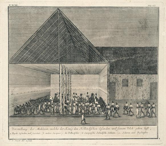 Keywords: AMH-7100-KB The meal enjoyed by the Dutch envoys to the king of Candy in 1736.jpg Artwork nl De maaltijd die de Hollandse ambassade met de koning van Candy gebruikte in 1736 nl De maaltijd die de Hollandse ambassade met de Koning van Candy gebruikte in 1736 Vorstellung der Mahlzeit welche der König den Holländischen Gesanden und seinem Volck geben ließ Linksboven No XCIII Rechtsboven pag 277 Legenda a Beyde Gesanden und Secretair / b andere Europaeer / c die Dollmetscher / d Europaeische Inländische Soldaten / Sclaven und Beyläufers en The meal enjoyed by the Dutch envoys to the king of Candy in 1736 Vorstellung der Mahlzeit welche der König den Holländischen Gesanden und seinem Volck ließ lie Top left No XCIII Top right pag 277 Key a Beyde Gesanden und Secretair / b andere Europaeer / c die Dollmetscher / d Europaeische Inländische Soldaten / Sclaven und Beyläufers Atlas of Mutual Heritage kb http //www atlasofmutualheritage nl/en/object/ id 7100 Source at the Atlas of Mutual Heritage en Subjects survey / view interior cross-section / profile meeting / visit building Person European Asians Africans nl Onderwerpen overzicht / aanzicht interieur doorsnede / profiel ontmoeting / bezoek gebouw Persoon Europeanen Aziaten Afrikanen en Post this image is related to a VOC trading post called http //www atlasofmutualheritage nl/en/post/ id 515 Kandy Inscription Vorstellung der Mahlzeit welche der König den Holländischen Gesanden und seinem Volck geben ließ author J W Heydt del et sculp nl between 1736 1744 Creator Johann Carl Tetschner Creator Johann Wolfgang Heydt nl Johann Carl Tetschner uitgever Johann Wolfgang Heydt tekenaar en graveur en Johann Carl Tetschner publisher Johann Wolfgang Heydt draughtsman and engraver Institution Koninklijke Bibliotheek nl koperdruk op papier en copperplate printing on paper Size cm 25 29 accession number 2102 A 7 p 277 PD-Art-100 Dutch East India Company 1730s |