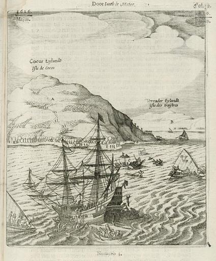 | Keywords: AMH-8123-KB View of Cocos Island and Traitors' Island.jpg Artwork nl Gezicht op Cocos Eiland en Verrader Eiland nl Gezicht op Cocos Eiland en Verrader Eiland Linksboven 1616 / Majus Middenboven Door Iacob le Maire Rechtsboven fol 39 / 1616 / Majus Middenonder Numero 3 Op de prent is te zien hoe de inwoners van Verraders Eiland het schip de Eendracht met stenen belagen omdat ze onder de indruk zijn van de hardheid van het hout waar het schip van gemaakt is De Hollanders voelden zich geïntimideerd en schoten met musketten Hierop kreeg het eiland de naam 'Verraders Eiland' De dagen ervoor was het contact redelijk goed verlopen De reis van Schouten en Le Maire werd in 1615 uitgerust door de vader van Le Maire voor de Australische Compagnie Deze compagnie probeerde het octrooi van de VOC te omzeilen door een andere route naar Indonesië te vinden Dit lukte Schouten en Le Maire door om Vuurland heen te zeilen in plaats van door de straat Magelaen Ondanks hun ontdekkingen was hun reis niet erg succesvol eenmaal in Batavia werden ze niet geloofd en het overgebleven schip de Eendracht werd met lading in beslag genomen Cocos Eiland heet tegenwoordig Tafahi Verraders Eiland wordt nu Niuatoputapu genoemd Beide eilanden maken deel uit van het koninkrijk Tonga Cf Universiteitsbibliotheek Amsterdam inv nr O 67 51 na p 44 en View of Cocos Island and Traitors' Island Top left 1616 / Majus Top centre Door Iacob le Maire Top right fol 39 / 1616 / Majus Bottom centre Numero 3 The print shows inhabitants of Verraders Eiland Traitors' Island pelting the Eendracht with stones because they are impressed with the hardness of the wood of which the vessel is made The Dutch felt threatened and responded with musket fire The island subsequently became known as 'Verraders Eiland' During the days before this incident contact between the two sides had progressed relatively well The expedition undertaken by Schouten and Le Maire was equipped in 1615 by Le Maire's father for the Australische Compagnie This company attempted to circumvent the VOC's patent by finding an alternative route to Indonesia Schouten and Le Maire succeeded in their quest by sailing around Vuurland instead of through the Magellan Straits But despite their discovery of a new route their expedition was not very successful Once they reached Batavia their story was not believed and their remaining vessel the Eendracht was confiscated along with its cargo Cocos Island is now known as Tafahi while Traitors' Island is called Niuatoputapu Both islands are part of the kingdom of Tonga Cf Universiteitsbibliotheek Amsterdam inv nr O 67 51 after p 44 Atlas of Mutual Heritage kb http //www atlasofmutualheritage nl/en/object/ id 8123 Source at the Atlas of Mutual Heritage en Subjects survey / view blockade / naval battle ship / vessel Person Asians Africans European nl Onderwerpen overzicht / aanzicht blokkade / zeeslag schip / vaartuig Persoon Aziaten Afrikanen Europeanen 1622 Creator M Colijn nl M Colijn uitgever Anoniem / Anonymous graveur / etser en M Colijn publisher Anoniem / Anonymous engraver / etcher Institution Koninklijke Bibliotheek nl gravure op papier en engraving on paper Size cm 15 5 12 5 accession number 108 D 7 dl III folio 39 PD-Art-100 1622 Jacob le Maire Willem Schouten Eendracht 1615 ship |