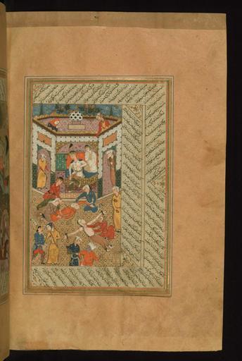Keywords: Amir Khusraw Dihlavi - Bahram Gur Watching Justice Being Served to a Man and a Woman - Walters W657210B - Full Page.jpg Walters Art Museum artwork Creator Amir Khusrow This folio from Walters manuscript W 657 depicts Bahram Gur watching justice being served to a man and a woman century 16 Safavid ink and pigments on tinted laid paper cream for text area and rose or light brown for margins cm 28 19 accession number W 657 210B 83312 Mundir date and mode of acquisition unknown seal impression with motton on fol 280b Khwand Mulla Mahdi Sahhaf-i Tabrizi Tabriz 1295 AH/AD 1878 mode of acquisition unknown note regarding re-binding and restoration of this volume by the bookbinder on front flyleaf iia Henry Walters Baltimore date and mode of acquisition unknown Walters Art Museum Henry Walters Acquired by Henry Walters place of origin India Walters Art Museum license 2D Nizami and Amir Khusraw Poems Walters MS 657 Media contributed by the Walters Art Museum needs category review |