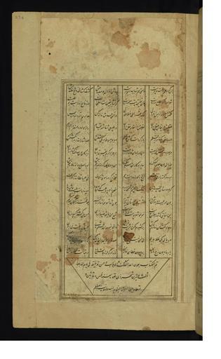| Keywords: Amir Khusraw Dihlavi - Colophon - Walters W622274A - Full Page.jpg This folio from Walters manuscript W 622 contains a colophon islamic 1529 935 Safavid ink pigments laid paper cm 27 0 16 5 accession number W 622 274A 83670 Muhammad 'Ali Shirazi ibn Muhammad Qasim Shirazi 1250 mode of acquisition unknown Henry Walters Baltimore date and mode of acquisition unknown Walters Art Museum Henry Walters Acquired by Henry Walters Transliteration place of origin Iran Walters Art Museum license 2D Khamsa of Amir Khusraw Walters MS 622 Media contributed by the Walters Art Museum needs category review |