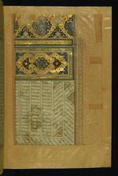 | Keywords: Amir Khusraw Dihlavi - Incipit with Illuminated Titlepiece - Walters W6571B - Full Page.jpg Walters Art Museum artwork Creator Amir Khusrow This illuminated titlepiece from Walters manuscript W 657 is inscribed in white Tawqi'/Riqa' script Makhzan al-asrar-i Shaykh-i Nizami 'alayhi al-rahmah Three small triangular pieces at the beginning of the text introduce Matla' al-anwar the first poem of the Khamsah of Dihlavi There is one cornerpiece with floral design century 16 AD Safavid ink pigments laid paper ink and pigments on tinted laid paper cream for text area and rose or light brown for margins cm 28 19 accession number W 657 1B 83287 Mundir date and mode of acquisition unknown seal impression with motton on fol 280b Khwand Mulla Mahdi Sahhaf-i Tabrizi Tabriz 1295 AH/AD 1878 mode of acquisition unknown note regarding re-binding and restoration of this volume by the bookbinder on front flyleaf iia Henry Walters Baltimore date and mode of acquisition unknown Walters Art Museum Henry Walters Acquired by Henry Walters place of origin India Walters Art Museum license 2D Nizami and Amir Khusraw Poems Walters MS 657 Media contributed by the Walters Art Museum needs category review |