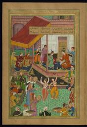 Keywords: Amir Khusraw Dihlavi - Khusraw and Shirin Preside Over the Wedding of Youths - Walters W62458A - Full Page.jpg This folio from Walters manuscript W 624 depicts a scene from the Shirin va Khusraw The union of 10 couples had been arranged by Khusraw who sits with Shirin in celebration In the spirit of the happy ceremony Khusraw asks Shirin to marry Although in love with him the Armenian princess declines The inscription in red in the border reads 'amal-i the work of Sanwalah between 1597 1598 Mughal ink pigments laid paper cm 28 5 19 accession number W 624 58A 9407 Muhammad Zaki 1241 AH/AD 1825-1826 mode of acquisition unknown oval seal fols 1a 211a 'abd al-raji Muhammad Shafi' 1247 AH/AD 1831-1832 mode of acquisition unknown rectangular seal fols 1a 211a Muhammad 'Ali date and mode of acquisition unknown large oval seal with no date on fol 211a Henry Walters Baltimore date and mode of acquisition unknown Walters Art Museum Henry Walters Acquired by Henry Walters Pearls of the Parrot of India The Emperor Akbar's Illustrated Khamsa 1597-1598 The Walters Art Museum Baltimore; The Metropolitan Museum of Art New York 2005-2006 place of origin Lahore Pakistan Walters Art Museum license 2D Khamsa of Amir Khusraw Walters MS 624 16th-century Mughal miniatures 1590s paintings from India Hindu wedding in art Marriage in art of India |