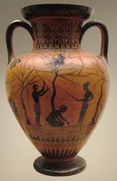 Keywords: Amphora olive-gathering BM B226.jpg Artwork Creator Antimenes Painter object type LangSwitch Το μάζεμα της ελιάς ελανόμορφος αττικός αμφορέας α ό τον ζωγράφο του Αντιμένη ερί ου 520 Χ Βρέθηκε στο Vulci της Ιταλίας Scene of olive-gathering by young people Attic black-figured neck-amphora ca 520 BC From Vulci Italy Scène de récolte d'olives par des adolescents Amphore à col attique à figures noires du Peintre d'Antiménès vers 520 av J -C Vulci - Italie Sul corpo lato A Incontro tra Eracle e Folo quest'ultimo con un ramo sulla spalla sinistra da cui pendono una lepre e una volpe e un uccello Dietro Eracle c'è Hermes seduto Sul corpo lato B raccolta delle olive Tre alberi su quello al centro un giovane nudo seduto con un bastone in mano con il quale scuote i rami Due figure vestite e con la barba battono gli alberi con lunghi bastoni Ai piedi dell'albero centrale c'è un giovane nudo in ginocchio che raccoglie in un cestino le olive cadute ~ 520 BCE black-figure pottery Size cm 40 64 Institution British Museum Upper floor room 69 Greece and Rome Daily Life case 3 British Museum online 399909 1837 0609 42 amphora object history Vulci Viterbo ProvenanceEvent 1837 purchase Lucien Bonaparte Prince of Canino and Musignano 1775 - 1840 credit line place of creation Athens accession number 1837 0609 42 Cat Vases B 226 Steff own Renamed from Image Greek pottery jpg other versions <gallery> File Amphor h jpg File Greek pottery png File Greek potteryOlive jpg </gallery> Atelier graphique Amphora olive-gathering British Museum B226