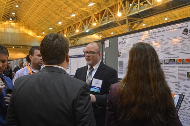 Keywords: goes-r goesr user readiness userreadiness events conferences and events conferencesandevents conferences noaa satellites noaasatellites noaa satellite and information service noaasatelliteandinformationservice nesdis proving ground provingground Kim Runk and Chad Gravelle explain their poster "Results from Evaluating Different GOES-R Scanning Strategies at the NWS Operations Proving Ground." Between February and April of 2015, the National Weather Service (NWS) Operations Proving Ground (OPG) hosted and facilitated an evaluation of the usefulness of 1-minute satellite imagery for NWS operations in the GOES-R series era. The overarching goal of the evaluation was to provide quantitative and qualitative guidance to NWS management, including the regional NWS Scientific Services Division Chiefs, on how satellite imagery with a refresh rate of 1 minute impacts NWS forecaster decision making. In total, seventeen NWS forecasters completed eight simulations that were developed using imagery from the 2013 and 2014 GOES-14 Super Rapid Scan Operations for GOES-R. SRSOR imagery: cimss.ssec.wisc.edu/goes/srsor2015/GOES-14_SRSOR.html Original photo source: www.goes-r.gov/multimedia/events.html Kim Runk and Chad Gravelle explain their poster "Results from Evaluating Different GOES-R Scanning Strategies at the NWS Operations Proving Ground." Between February and April of 2015, the National Weather Service (NWS) Operations Proving Ground (OPG) hosted and facilitated an evaluation of the usefulness of 1-minute satellite imagery for NWS operations in the GOES-R series era. The overarching goal of the evaluation was to provide quantitative and qualitative guidance to NWS management, including the regional NWS Scientific Services Division Chiefs, on how satellite imagery with a refresh rate of 1 minute impacts NWS forecaster decision making. In total, seventeen NWS forecasters completed eight simulations that were developed using imagery from the 2013 and 2014 GOES-14 Super Rapid Scan Operations for GOES-R. SRSOR imagery: cimss.ssec.wisc.edu/goes/srsor2015/GOES-14_SRSOR.html Original photo source: www.goes-r.gov/multimedia/events.html |